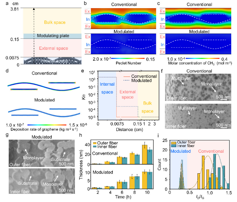 3- 摩爾濃度(c)和石墨烯沉積率(d)的分布圖。 (c)、(d)中的白色虛線表示 GGFF 的位置。 Ex 和 In 分別代表 GGFF 的外部和內(nèi)部空間。 (e) GGFF 周圍內(nèi)部、外部和主體空間的 Kn 計(jì)算值。 (f,g)在傳統(tǒng)(f)和調(diào)制(g)系統(tǒng)中獲得的 GGFF 外部(向上)和內(nèi)部(向下)纖維上石墨烯的 SEM 圖像。 生長條件: 1373 K,常壓,CH