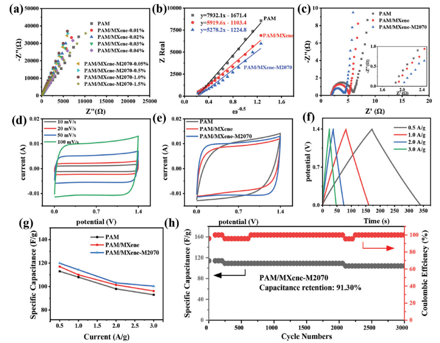 Fig 3. a) 紐扣電池的 EIS,b) PAM、PAM/MXene 和 PAM/MXene-M2070 的 Warburg 阻抗因數,c) PAM、PAM/MXene(MXene-M2070 含量為 0.02%)和 PAM/MXene-M2070(MXene-M2070 含量為 1%)超級電容器的 EIS,d) PAM/MXene-M2070(MXene-M2070 含量為 1%)超級電容器的 CV 曲線,e) 三種超級電容器的 CV 比較,f) PAM/MXene-M2070(MXene-M2070 含量為 1%)超級電容器的 GCD 曲線, g) 0.5–3 A g