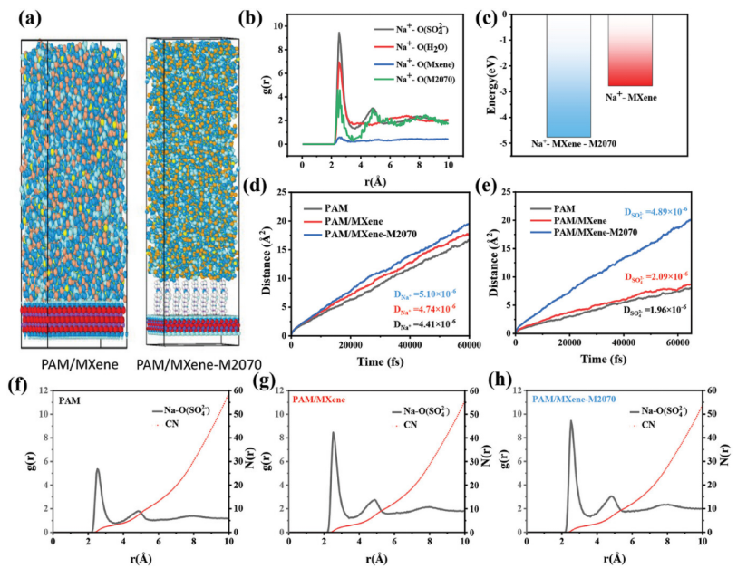 Fig 4. a) PAM/MXene 和 PAM/MXene-M2070 的分子模型。b) PAM/MXene-M2070 的徑向分布函數 RDF 曲線。c) Na