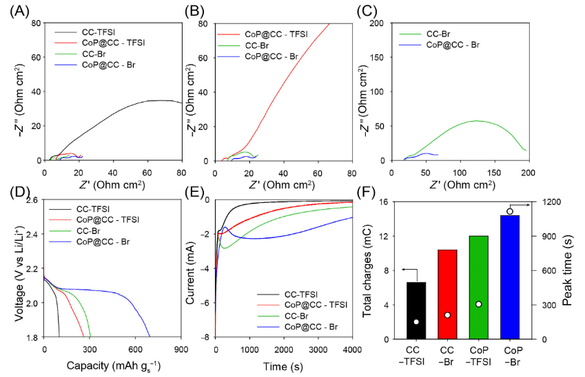 s−1 的放電容量下獲得的 CC-TFSI、CC-Br、CoP@CC-TFSI 和 CoP@CC-Br 電池的奈奎斯特圖。(D) 具有完全放電陰極和新鮮含多硫化鋰陰極的重新組裝的 Li-S 電池的恒流放電曲線。CC-TFSI、CoP@CC-TFSI、CC-Br 和 CoP@CC-Br 電池的計時安培圖和 (F) 計時安培圖的峰值時間和 4000 s 持續時間的總電荷。