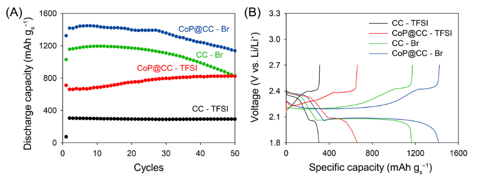 鋰硫電池的硫利用效率往往受到絕緣 Li2S 不受控制的電沉積和由此產生的電極鈍化的限制。通過誘導具有位置選擇性的形貌控制Li?S電沉積,成功緩解了硫正極的鈍化問題。研究者將CoP納米針電極與高配位數(含LiBr)的電解質相結合,使Li?S在CoP針尖端選擇性成核并進行三維(3D)生長,而針的下部在放電過程中保持未鈍化狀態,從而實現了1400 mAh g?¹的高放電容量。通過對比評估未使用CoP納米針電極和/或LiTFSI電解質的電池,研究結果表明,尖端效應與高Li?S溶解度的結合有效延緩了電極鈍化。因此,該研究提供了一種控制Li?S沉積位點和沉積形貌的新方法,并提出了一種通過電極和電解質設計協同作用來實現高性能鋰硫電池的新策略。此外,該研究中的選擇性沉積技術,有望應用于下一代電池,如鋰氧電池,這類電池同樣面臨電極鈍化的挑戰。