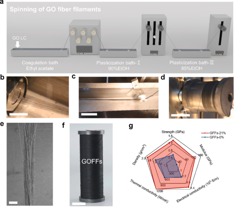 圖1.GOFFs的制備工藝a) GOFFs連續(xù)濕紡裝置;b) 100孔噴絲板特寫;c)塑化浴中100長(zhǎng)絲的GO纖維;d)將GOFFs收集到石墨收集器上;e) GOFFs的SEM圖像;f)石墨卷軸上大型GOFFs數(shù)字圖像;g)改性石墨烯纖維長(zhǎng)絲(紅線)和新生石墨烯纖維長(zhǎng)絲(藍(lán)線)的整體力學(xué)和輸運(yùn)特性。b)、c)、d)、e)、f)中的比例尺分別為20mm、100mm、35mm、500 μm、30mm。