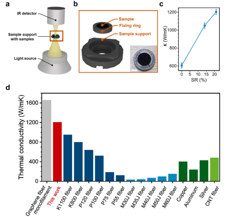 圖4. GFFs的熱性能a)激光閃光法測(cè)量導(dǎo)熱系數(shù)原理示意圖;b)纖維樣件及樣件支架示意圖及數(shù)字圖,比例尺5mm;c)不同SRs下GFFs的導(dǎo)熱系數(shù);d) GFFs -21%與其他金屬纖維、PAN基碳纖維、瀝青基碳纖維、碳納米管纖維和石墨烯纖維單絲的導(dǎo)熱系數(shù)比較。