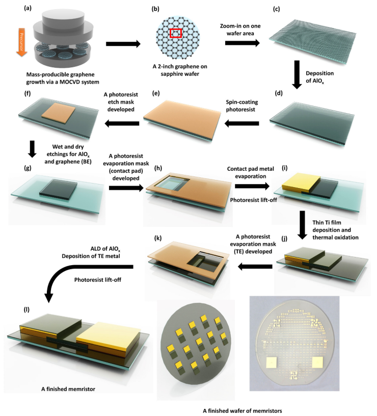 圖2. 石墨烯電極基憶阻器制造的一般工藝流程。(a)通過工業標準MOCVD系統在藍寶石晶圓上生長大規模單層石墨烯;(b)來自單個制造批次的一個石墨烯晶圓,(c)是晶圓上的放大區域。(d)在晶圓片上熱蒸發薄層AlOx。(e-g)石墨烯底電極(BE)定義。光抗蝕劑被旋轉涂覆在晶圓的頂部,并通過工業標準的光刻工藝開發光抗蝕劑蝕刻掩模。濕蝕刻和干蝕刻分別在AlOx和石墨烯上進行,用于活性區域的圖案化。(h)和(i)接觸墊定義。采用光刻工藝制備接觸墊蒸發掩膜,然后進行金屬(Ti/Au)沉積和抗蝕劑/殘余金屬剝離工藝。(j - 1)憶阻器活性材料的沉積和提升。沉積Ti薄膜,然后熱氧化生成TiOx(重復一次以增加厚度)。然后進行另一光刻工藝以確定電介質和TE的面積。隨后通過原子層沉積(ALD)和熱蒸發(Au)沉積薄AlOx層。在設備完成之前,進行最后一步的抗蝕劑/殘余金屬剝離。最后通過原理圖和照片說明了完整的憶阻器器件晶圓。