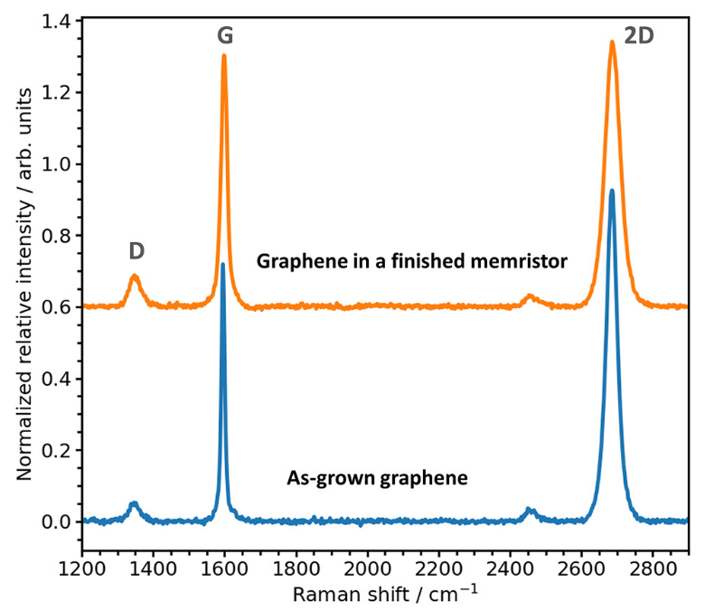 圖3. 經過幾個光刻步驟后,藍寶石襯底上生長的石墨烯和成品記憶電阻器中的石墨烯減去背景后的拉曼光譜(532 nm激發)。計算得到的石墨烯的峰面積比特征值為ID/IG = 0.25±0.02,I2D/IG = 3.96±0.16;成品憶阻器中石墨烯的ID/IG = 0.25±0.04,I2D/IG = 2.26±0.21。生長石墨烯的G峰為11.8±0.7,成品石墨烯的G峰為15.0±1.6。平均值為2片不同晶圓上3-4個不同點的數據的算術平均值,誤差條為實驗誤差和光譜擬合誤差的誤差傳播所產生的標準誤差。