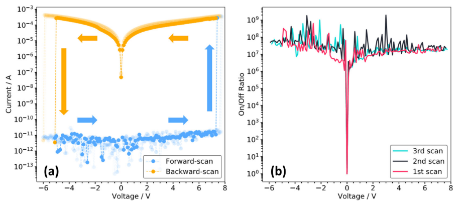 圖4. (a)低源率(0.5 Hz - 1 Hz)的單個石墨烯電極憶阻器的電流-電壓(IV)初始掃描。有3輪連續掃描,第一輪掃描純色填充,其他掃描稍微透明,以更好地觀察目的。箭頭表示電壓掃向。