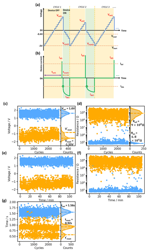 圖5. 石墨烯電極基憶阻器的續航和保持特性。(a)和(b)憶阻器驅動電壓信號模式和器件電流示意圖。(c)和(d)分別為器件電壓(Vset和Vreset)和器件電阻(Ron和Roff)的持久特性和(e)和(f)保持特性。(g)設置和重置周期時間。