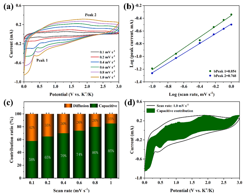 圖8. (a)FeSbSe-NGCNFs 在不同掃描速率下對 PIBs 的 CV 曲線。(b)FeSbSe-NGCNFs 的峰值電流與掃描速率的線性關(guān)系。(c)FeSbSe-NGCNFs 的電容和擴(kuò)散控制容量的歸一化比例。(d)FeSbSe-NGCNFs 在 1.0 mV s