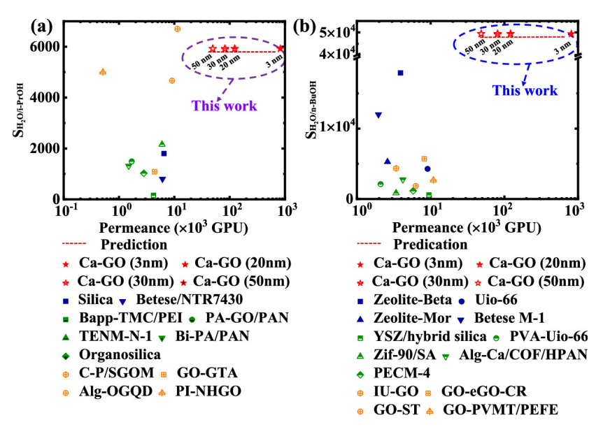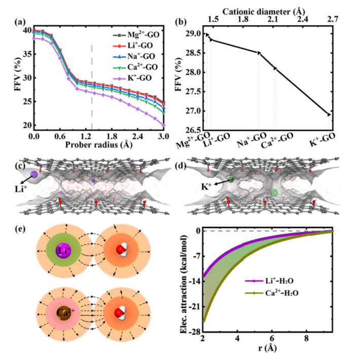 近年來,機器學習(ML)和分子模擬改變了傳統膜材料的研發模式。該研究采用ML輔助設計離子化GO膜,建立了包括溫度、化學基團、離子負載量、離子大小和電荷等描述符與膜性能之間的多變量預測模型。采用分子模擬探究GO的水穩定性:傳統觀點認為GO穩定機制源于“離子-π”作用;該研究考慮離子的實際水合效應,提出“類根狀氫鍵”穩定膜層及水分子“彈道傳輸”機制。通過探索不同陽離子,發現Ca2+-GO膜最具氫鍵穩定性和靜電捕水能力;通過滲透汽化測試,該ML設計的GO膜對異丙醇和丁醇表現出優異的脫水性能,分離因子分別達到5922和46369,滲透性約48.5-123.6 GPU,遠超現有的分離膜報道。該研究發展ML加速了高性能膜材料開發并揭示GO膜的水穩定機制,為研究者提供了定向設計思路與參考機制。