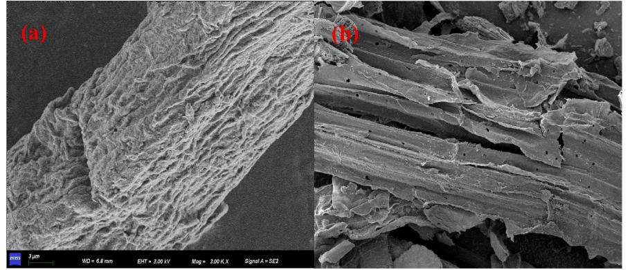 圖2. 樣品的 SEM 圖像((a) SCN,(b) 未處理的玉米秸稈。