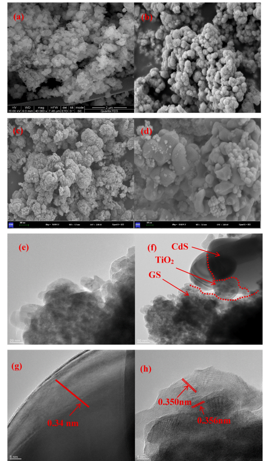 圖3. SEM 圖像((a) TiO2、(b) CdS、(c) TC、(d) GS);TEM 圖像((e) GS、(f) TC3-GS);HRTEM((g) GS、(h) TC3-GS。