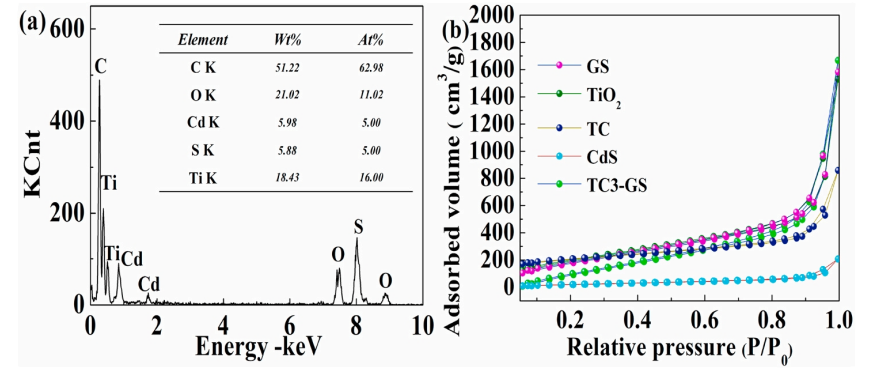圖4. . (a) TC3-GS EDS 光譜,(b) 樣品的 N2 吸附-解吸等溫線。