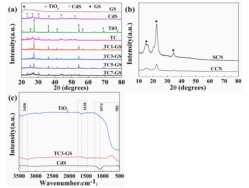 圖5. (a)樣品的XRD圖譜,(b)秸稈預處理前后微晶纖維素的XRD圖譜,(c)TiO2、CdS、TC3-GS的FT-IR光譜。