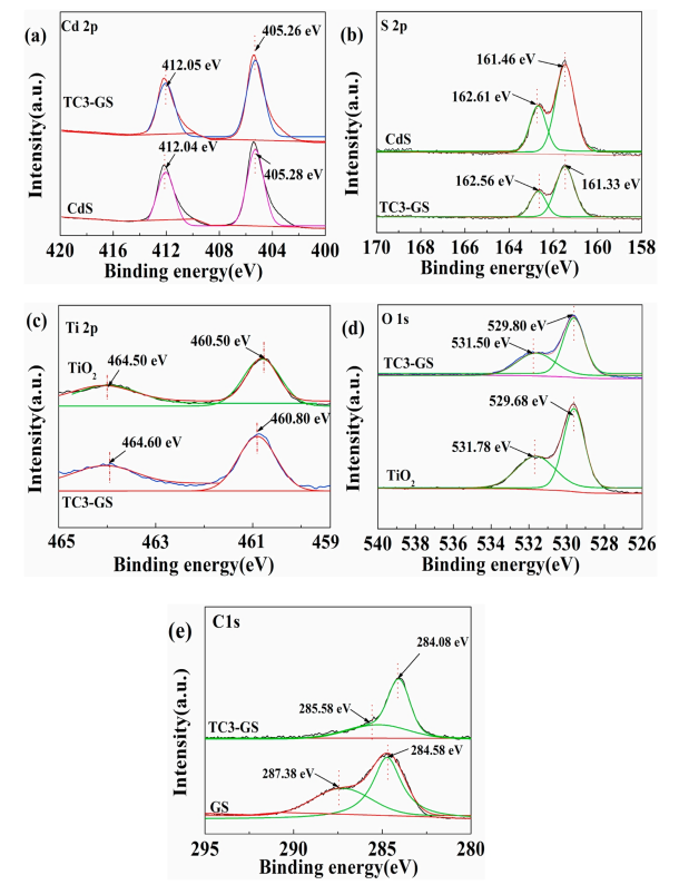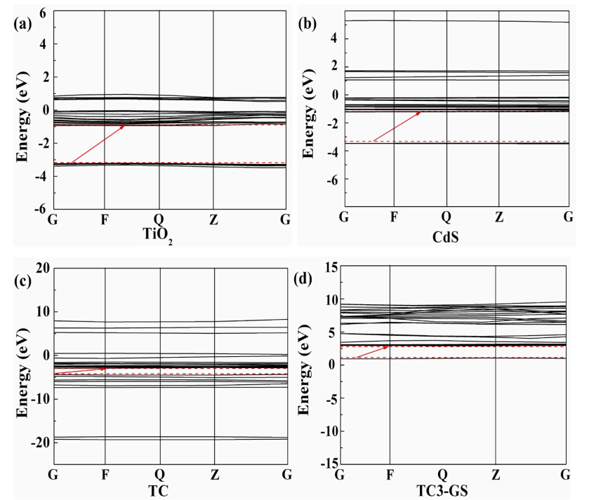 圖11. (a) TiO2、(b) CdS、(c) TC 和 (d) TC3-GS 的能量結構。
