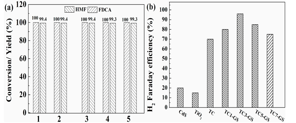 圖8. TC3-GS的HMF轉化率和FDCA產率的循環實驗(a);H2法拉第效率(b)。