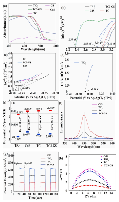 圖9. (a) UV-VIS DRS 光譜;(b) Tauc 圖;(c) TC、CdS、TC3-GS MottSchottky 圖;(d) TiO2 Mott-Schottky 圖;(e) 帶隙結構,(f) PL 光譜,(g) 瞬態光電流,(h) EIS 光譜。