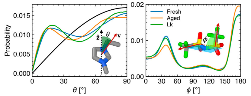 圖8.氧化石墨烯界面上初級層中IL的取向分布。(a)干界面(黑線)和濕界面(亮線)的EMIM環法線與z單元胞向量的概率分布。黑色虛線表示均勻角度樣本的函數形式。(b)干(黑線)和濕(亮線)界面的遠端CF