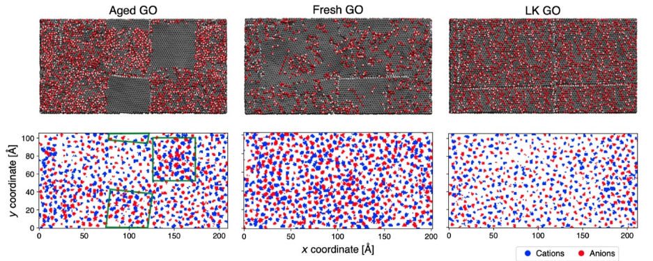 圖5. 上氧化石墨烯界面第一IL層離子遷移率的比較。上氧化石墨烯表面的圖像顯示在頂部一行,而底部一行的顏色圖表示在30 ns的過程中任何點被陽離子(藍色)和陰離子(紅色)占據的空間區域。對于新鮮氧化石墨烯,缺乏氧含量的表面的石墨疇在底部的顏色圖上用綠色輪廓表示。