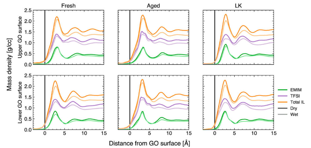 圖3. 比較經過粗糙度校正的EMIM、TFSI和總IL垂直密度分布在新鮮(藍線)、老化(橙線)和LK(綠線)GO - IL接口之間,注意GO堆疊的起始點被設置為零,并由垂直黑線表示。