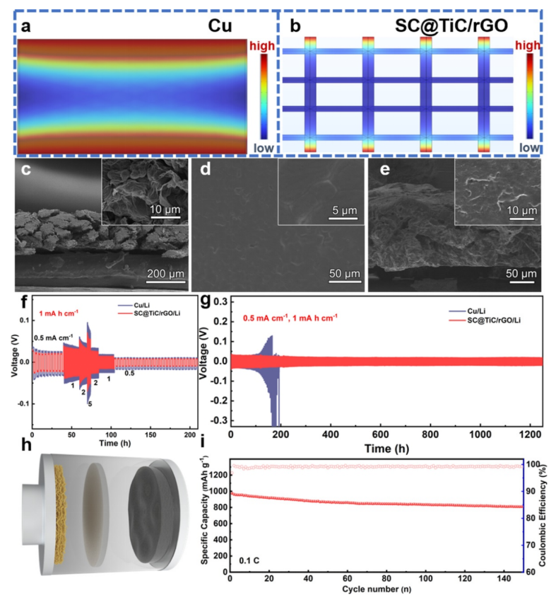 圖6.Cu箔和SC@TiC/rGO在COMSOL多物理場仿真中的仿真結(jié)果。(c) SC@TiC/rGO的SEM圖像。(d) SC@TiC/rGO/Li的俯視圖和(e)橫斷面圖像。對稱電池的電化學(xué)性能:(f)速率性能和(g)恒流循環(huán)。(h) SC@TiC/rGO- s∥SC@TiC/rGO/Li電池的全電池模型及循環(huán)性能。