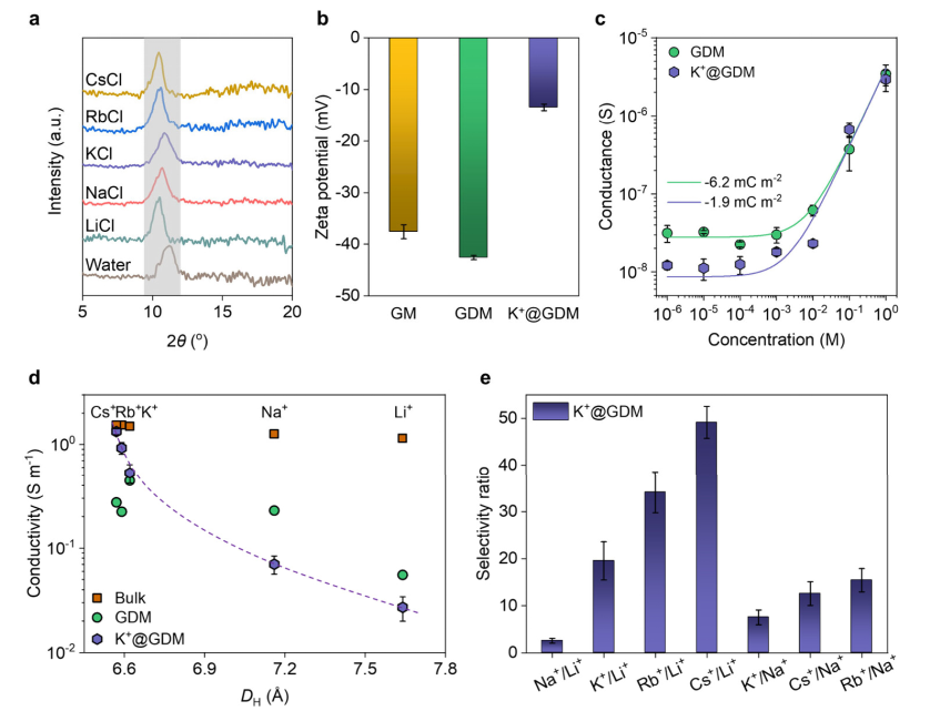 圖3. 電荷屏蔽 K+@GDM 的離子傳輸性能。 (a) 浸入 0.1 M LiCl、NaCl、KCl、RbCl 和 CsCl 和純水中后的 K+@GDM 的 XRD 圖案。 (b) 通過電泳光散射 (ELS) 測量在中性 pH 下 GM、GDM 和 K+@GDM 的 Zeta 電位。 (c) 在不同濃度 KCl 溶液下由 GDM 和 K+@GDM 制成的埃級通道的電導(dǎo)率。 為了區(qū)分,Rb+ (6.58 Å) 和 Cs+ (6.58 Å) 的 DH 分別繪制為 6.59 和 6.57 Å。 實線由支持信息中詳述的空間擴展表面?zhèn)鲗?dǎo)模型擬合。 (d) 0.1 M 氯化物溶液下 GDM 和 K+@GDM 的電導(dǎo)率。 實心方塊表示鹽的體積電導(dǎo)率。 紫色虛線是引導(dǎo)眼睛的。 (e)K+@GDM 的選擇性比率。誤差線來自三個獨立樣本。