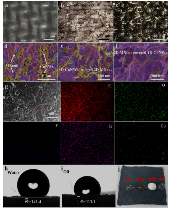 圖3. (a c) 棉織物、CuNWs-MXene-PEDOT@Cotton 織物和 CuNWs-MXene PEDOT-PEG@Cotton 織物的光學顯微鏡照片。(d f) 不同放大倍數下連接到 MXene 納米片的 CuNWs 納米線導電網絡的 SEM 圖像。(g) CuNWs 交織 MXene 導電網絡的 SEM 圖像和相應的 EDS 元素映射圖像。(h,i) 智能多響應棉織物的水和油接觸角。(j) 具有自清潔功能的智能多響應棉織物上的茶、可樂、牛奶和食用油的照片。
