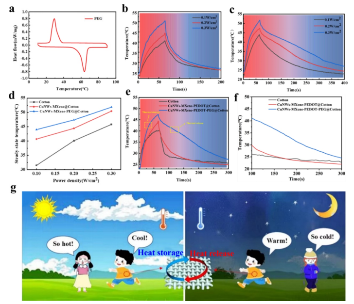 圖 4. (a)有機相變材料PEG 4000的差示掃描量熱(DSC)曲線。不同光功率密度(0.1、0.2、0.3 W/cm2)下(b)CuNWs-MXene-PEDOT@Cotton織物和(c)CuNWs-MXene PEDOT-PEG@Cotton織物的溫度變化。(d)不同功率密度下棉織物、CuNWs-MXene-PEDOT@Cotton織物和CuNWs-MXene PEDOT-PEG@Cotton織物的穩態溫度。(e)光功率密度為0.2 W/cm2時棉織物、CuNWs-MXene-PEDOT@Cotton織物和CuNWs-MXene PEDOT-PEG@Cotton織物的溫度變化對比,(f)其能量釋放過程局部放大圖。 (g)PCM集成智能多響應棉織物的儲熱和溫度調節示意圖。