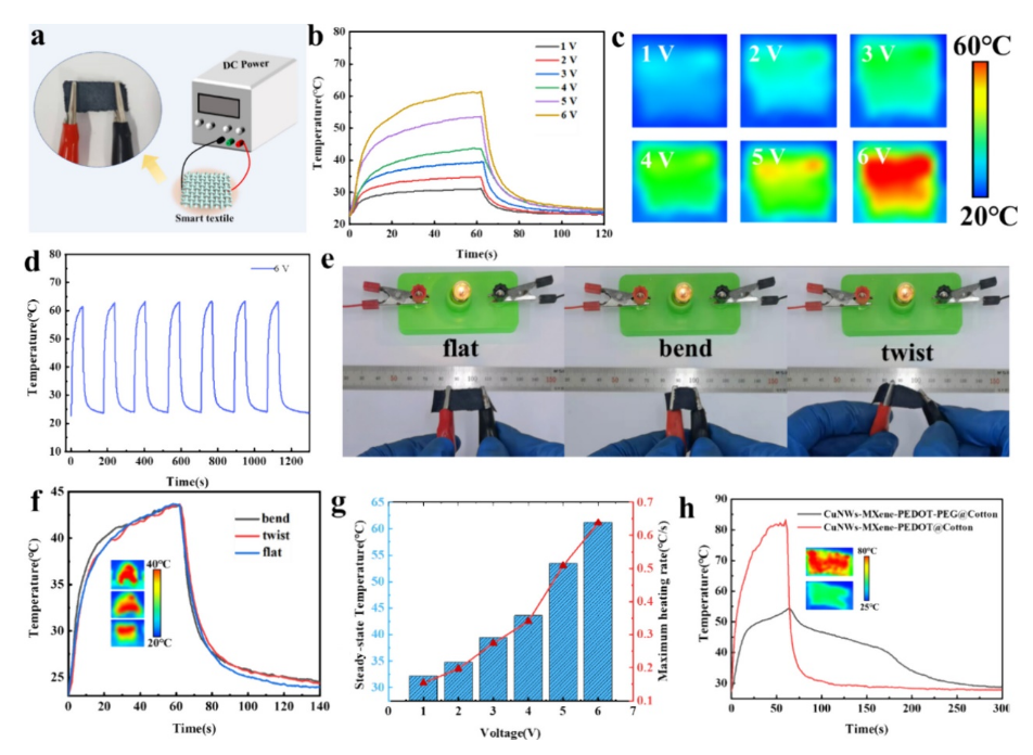 圖 5. 智能 CuNWs-MXene PEDOT-PEG@Cotton 織物的電熱性能。(a)對智能 CuNWs-MXene PEDOT-PEG@Cotton 織物施加電刺激的示意圖。(b)智能 CuNWs-MXene-PEDOT@Cotton 織物隨不同電壓(1-6 V)的溫度曲線,(c)不同電壓下相應的紅外熱圖。(d)6 V 輸入電壓下 CuNWs-MXene-PEDOT@Cotton 織物的溫度時間循環曲線。(e)智能 CuNWs-MXene PEDOT-PEG@Cotton 織物在不同狀態(平整、彎曲和扭曲)下作為導電路徑時小燈泡的亮度比較。(f)4 V 電壓下智能 CuNWs-MXene-PEDOT@Cotton 織物在不同狀態(平整、彎曲和扭曲)下的溫度響應曲線以及相應的紅外熱像。 (g)不同電壓刺激下CuNWs-MXene-PEDOT@Cotton織物的穩態溫度及對應的最大升溫速率。(h)6 V電壓刺激下CuNWs-MXene-PEDOT@Cotton織物與CuNWs-MXene PEDOT-PEG@Cotton織物溫度變化對比。