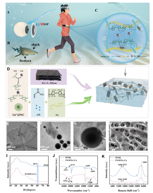 圖 1. PSML水凝膠傳感器的結(jié)構(gòu)和表征。(A)PSML水凝膠傳感器的應(yīng)用。(B)鱘魚的捕食方式。(C)PSML水凝膠的結(jié)構(gòu)。(D)PSML水凝膠的制備過程。(E)MXene的TEM表征。(F)LM和MXene的TEM表征。(G)LM和PAC的TEM表征。(H)PSML水凝膠的掃描電子顯微鏡(SEM)。(I)PSML水凝膠和PAM/SA-Ca水凝膠的XRD表征。(J)PSML水凝膠和PAM/SA-Ca水凝膠的傅里葉變換紅外光譜(FT-IR)表征。(K)PSML水凝膠和PAM/SA-Ca水凝膠的拉曼光譜表征。