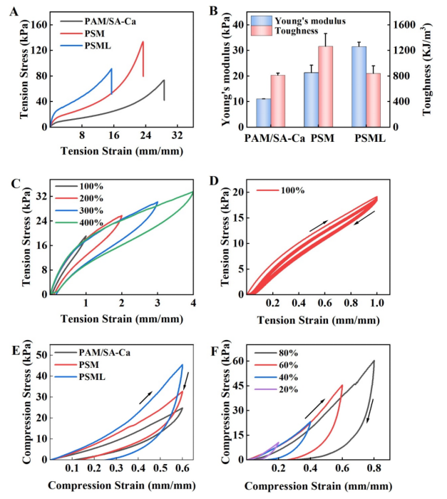 圖 2. PSML 水凝膠的機(jī)械性能測試。(A)PAM/SA-Ca、PSM 和 PSML 水凝膠的拉伸性能比較。(B)PAM/SA-Ca、PSM 和 PSML 水凝膠的韌性和彈性模量。(C)PSML 水凝膠在 100%-400% 拉伸應(yīng)變下的恢復(fù)率。(D)PSML 水凝膠在 100% 拉伸應(yīng)變下的 10 次循環(huán)。(E)PAM/SA-Ca、PSM 和 PSML 水凝膠的壓縮性能。(F)PSML 水凝膠在 20%-80% 應(yīng)變下的機(jī)械性能。