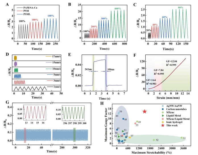 圖3. PSML水凝膠的電性能測試。(A)100%拉伸應(yīng)力下PAM/SA-Ca、PSM和PSML水凝膠的電阻變化率。(B)、(C)20%-400%拉伸應(yīng)力下PSML水凝膠的電阻變化率。(D)不同頻率下PSML水凝膠的電阻變化率。(E)PSML水凝膠的響應(yīng)時(shí)間。(F)PSML水凝膠的靈敏度-應(yīng)變圖。(G)500次循環(huán)后PSML水凝膠的電阻變化。(H)與其他文獻(xiàn)的拉伸性能和靈敏度的比較。