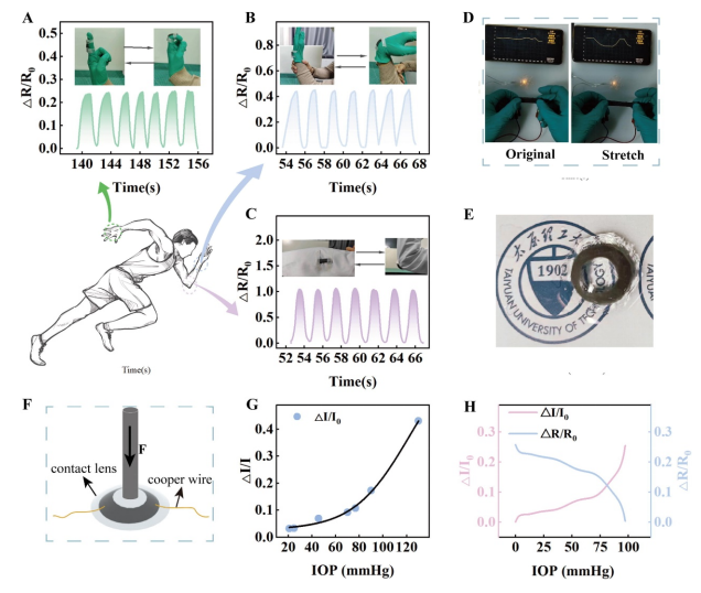 圖 4. PSML 水凝膠的應(yīng)用。PSML 水凝膠傳感器放置在 (A) 手指、(B) 手腕、(C) 肘部,用于人體運(yùn)動(dòng)測量。(D) 描繪了無線數(shù)據(jù)傳輸系統(tǒng)。(E) PSML 水凝膠作為帶有傳感單元的隱形眼鏡。(F) (H) 中所示測試的示意圖。(G) PSML 水凝膠作為帶有傳感單元的隱形眼鏡,放置在隔離眼球上進(jìn)行性能測試。
