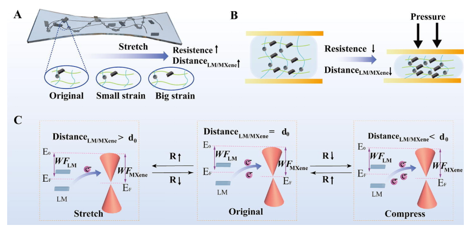 圖 5. PSML應(yīng)變傳感器的傳感機(jī)理。(A)PSML水凝膠拉伸過程中MXene與LM之間的位置關(guān)系變化及相應(yīng)的電阻變化。(B)PSML水凝膠壓縮過程中的變化及相應(yīng)的電阻變化。(C)LM與MXene之間的距離變化與電子遷移之間的關(guān)系。