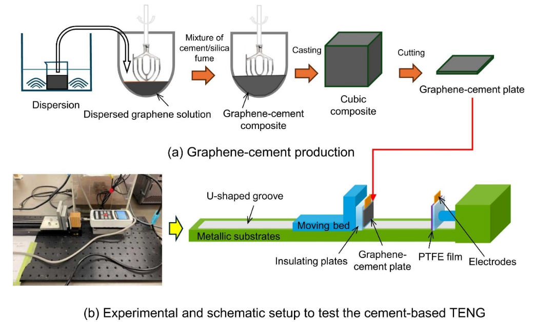 圖 1. 制備程序和實驗裝置:(a)石墨烯-水泥復合材料的生產;(b)水泥基TENG的成分、實驗配置和最終產品。