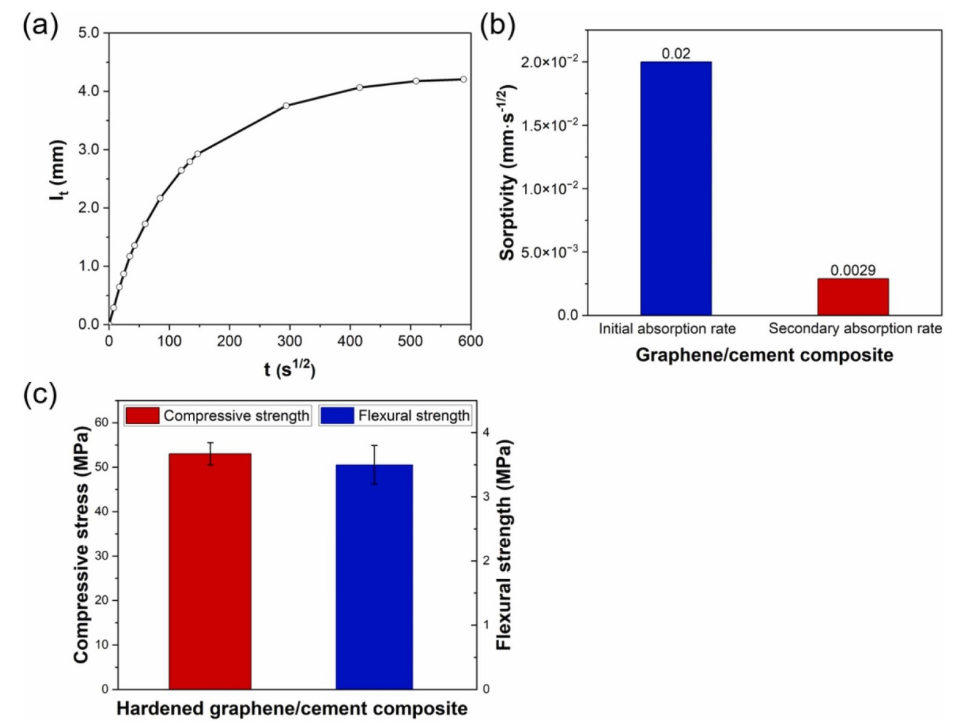 圖 2. 石墨烯-水泥復合材料的物理和機械性能:(a)吸水率;(b)一次和二次吸附率;(c)抗壓強度和抗彎強度。