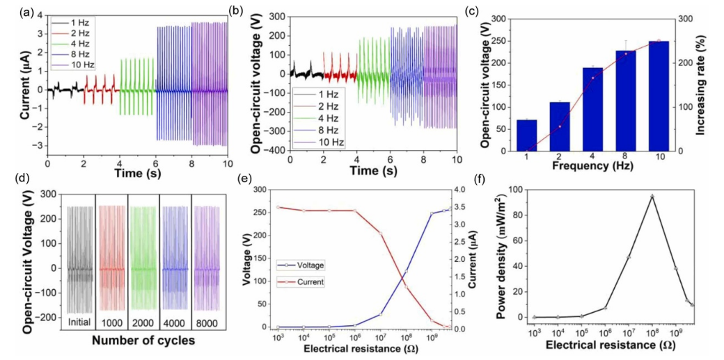 圖 5. 100 N 力作用下水泥基 TENG 的摩擦電性能:(a)頻率從 1 到 10 Hz 變化的短路電流;(b)使用 3 G© 電阻器時頻率變化的開路電壓;(c)電壓與頻率;(d)數千次循環后的穩定性;(e)和(f)不同負載電阻值下水泥基 TENG 輸出電壓、電流和功率密度。