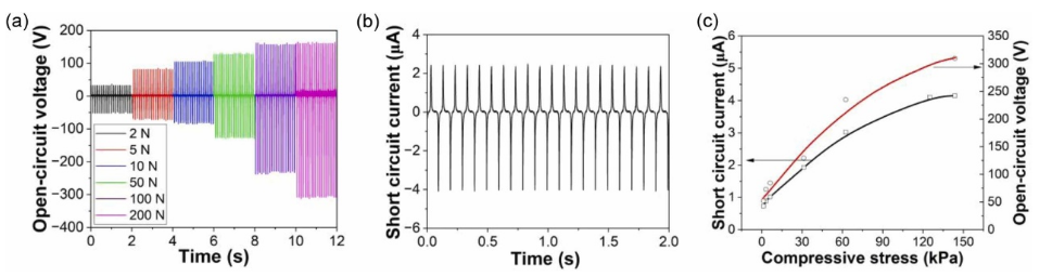 圖 6. 力幅對開路電壓和短路電流輸出的影響:(a)2、5、10、50、100 和 200 N 下的電壓輸出;(b)200 N 下的短路電流;(c)電壓和電流輸出與壓力的關系。