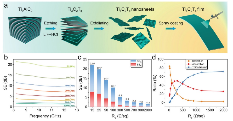x 薄膜的電可調 EMI 屏蔽特性。a) Ti