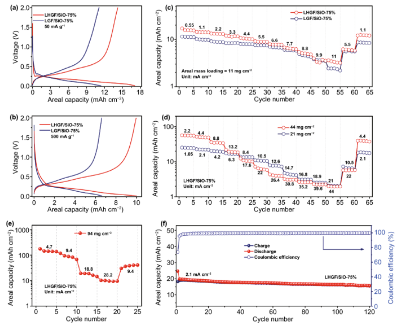 Fig 3. 兩種類型的電極在(a) 50 mA g?¹和(b) 500 mA g?¹時的恒流充放電曲線,質(zhì)量負(fù)荷為11 mg cm?²;(c) LHGF/SiO-75%和LGF/SiO-75%電極在質(zhì)量負(fù)載為11 mg cm?²時的倍率性能;(d) LHGF/SiO-75%電極在21和44 mg cm?²質(zhì)量負(fù)載下的倍率性能;(e) LHGF/SiO-75%電極在質(zhì)量負(fù)載為94 mg cm?²時的倍率性能;(f) LHGF/SiO電極在2.1 mA cm?²電流密度下,負(fù)載質(zhì)量為21 mg cm?²的循環(huán)性能。