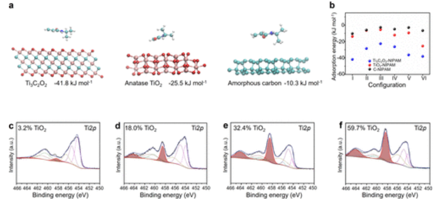 Fig 3. 具有不同 TiO2 原子分數的 PMM 的表征。a NIPAM 在 Ti3C2O2、銳鈦礦 TiO2 和無定形 C 上的優化最穩定的吸附構型,其中吸附能分別為 -41.8、-25.5 和 -10.3 kJ mol-1b 所有考慮的吸附構型的相應吸附能,表明 NIPAM 對 Ti3C2O2 的吸附能明顯高于銳鈦礦 TiO2 和無定形 C 上的吸附能。C-F TiO2-PMM 的核能級 Ti 2p 光譜,TiO2 原子分數為 3.2%、18.0%、32.4% 和 59.7%。