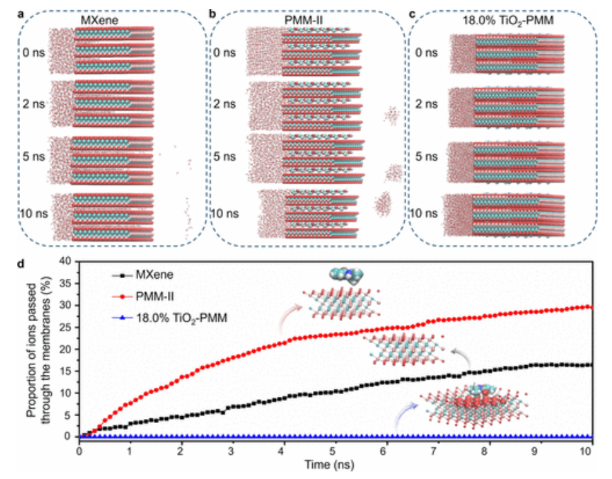 Fig 5. 通過 MXene 基膜的水滲透的 MD 模擬。a-c三組水滲透系統(MXene、PMM-II 和 18% TiO2-PMM)在 1、2、5 和 10 ns 處的模擬快照。d 滲透穿過檢查膜的水分子的比例。