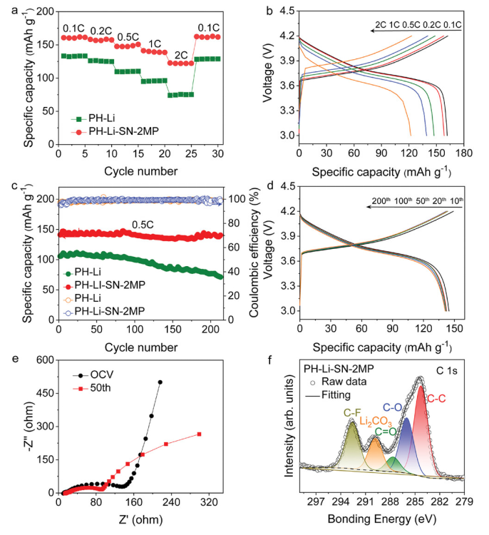 Fig 6. a) Li/PH-Li/LFP和Li/PH-Li-SN−2MP/LFP電池的倍率性能。b) Li/PH-Li-SN−2MP/LFP電池在不同倍率下的充放電曲線。c) Li/PH-Li/LFP和Li/PH-Li-SN−2MP/LFP電池在0.2 C下的循環性能。d) Li/PH-Li/LFP和Li/PH-Li-SN−2MP/LFP電池在0.5 C下的循環性能。e) Li/PH-Li-SN−2MP/LFP電池初始和50個循環后的EIS曲線。f) Li/PH-Li-SN−2MP/LFP全電池在0.5 C下50個循環后LFP陰極的C 1s核級區域的XPS圖譜。