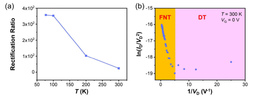 圖4. (a) 裝置在不同溫度下的精餾比。(b) MIS二極管的隧穿機制。