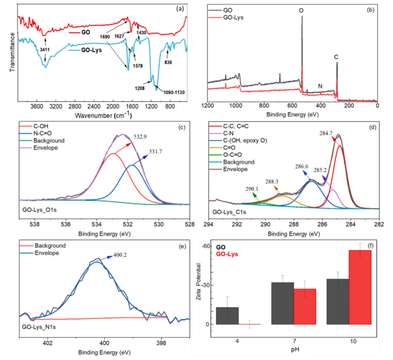 圖1. a:GO(紅線)和 GO-Lys(藍線)的 FTIR 光譜。b:使用完整 XPS 光譜對 GO 和 GO-Lys 進行全面表征。c-e:Cs1、Ns1 和 Os1 處的解卷積峰揭示了 GO-Lys 中氧、碳和氮的精確結合能,表明存在潛在的鍵合相互作用。f:GO 和 GO-Lys 的表面電荷(以 zeta 電位表示)與 pH S 的關系。
