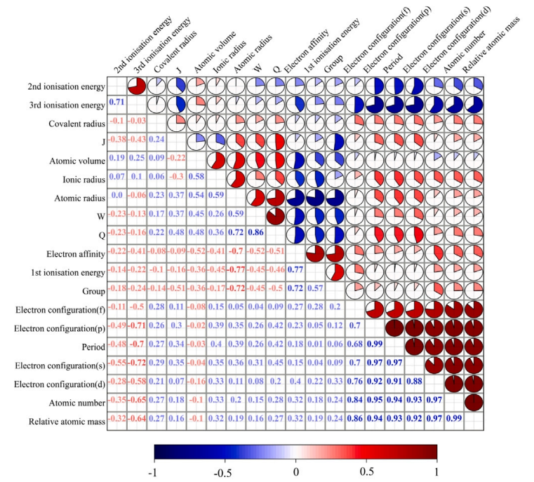 圖2. 計(jì)算結(jié)果與不同描述符之間的 Pearson 相關(guān)系數(shù)矩陣的熱圖。紅色和藍(lán)色表示正相關(guān)和負(fù)相關(guān)的強(qiáng)度。