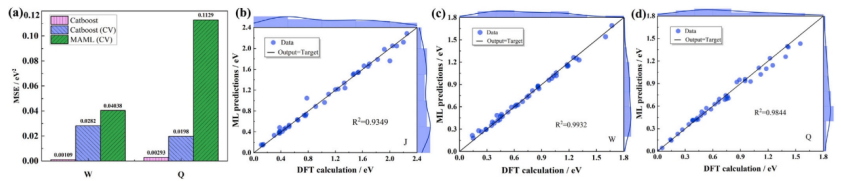 圖4. (a) 不同模型的均方誤差比較結(jié)果、確定系數(shù)以及(b)鋁基體、( c)石墨烯/鋁復(fù)合材料完美界面和(d)石墨烯/鋁復(fù)合材料缺陷界面的DFT比較機(jī)器學(xué)習(xí)預(yù)測結(jié)果。