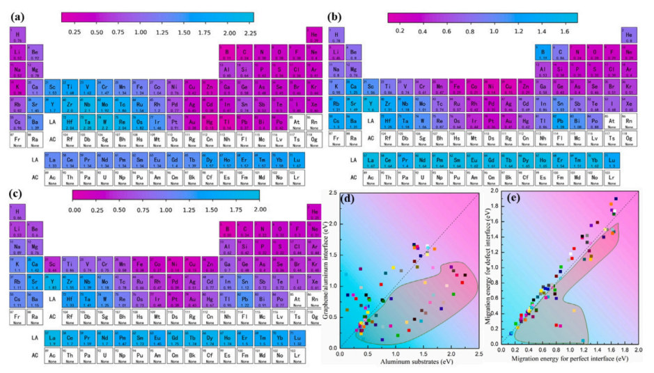 圖6. (a)鋁基質(zhì)、(b)石墨烯/鋁復(fù)合材料完美界面和(c)石墨烯/鋁復(fù)合材料缺陷界面的元素周期表擴(kuò)散遷移預(yù)測圖,(d)鋁基質(zhì)與石墨烯/鋁復(fù)合材料完美界面比較,(e)石墨烯/鋁復(fù)合材料完美界面與缺陷界面比較。