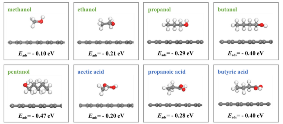 圖9. 石墨烯上的醇酸吸附構型(黑色、白色和紅色球分別代表C、H和O原子)。