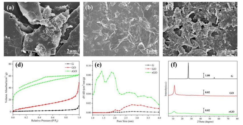 圖2. (a) G,(b) GO,(c)rGO的SEM圖譜;(d)N