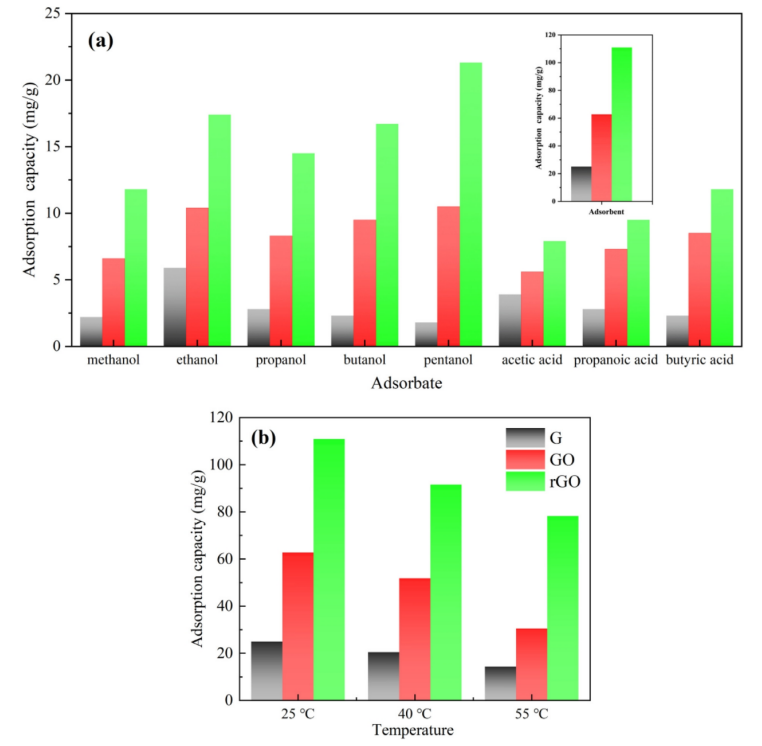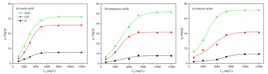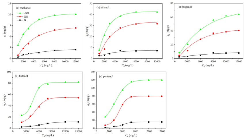 費托合成(FTS)廢水中的有機污染物低碳醇和酸是費托合成(FTS)工業化的限制因素。在這項工作中,研究了石墨烯上醇酸吸附和表面物質之間的結構容量關系,揭示了它們之間復雜的相互作用。以片狀石墨(G)為原料,采用改進Hummers法制備了氧化石墨烯(GO)和還原氧化石墨烯(rGO),并通過SEM、XRD、XPS、FT-IR和Raman表征了樣品的理化性質。通過理論和實驗方法測定了醇酸對G、GO和rGO的吸附行為和吸附量。結果表明,COOH、C=O和C-O在石墨烯上的存在占據了吸附位點,增加了水與石墨烯的相互作用,不利于醇酸的吸附。醇和酸的平衡吸附量隨碳數的增加而增加。通過模型擬合驗證了石墨烯上的單層吸附。由于氧的減少,還原氧化石墨烯具有最高的FTS模擬廢水吸附量(110 mg/g),。這些新發現為醇酸廢水的處理,以及高性能碳基吸附材料的設計和開發提供了基礎。